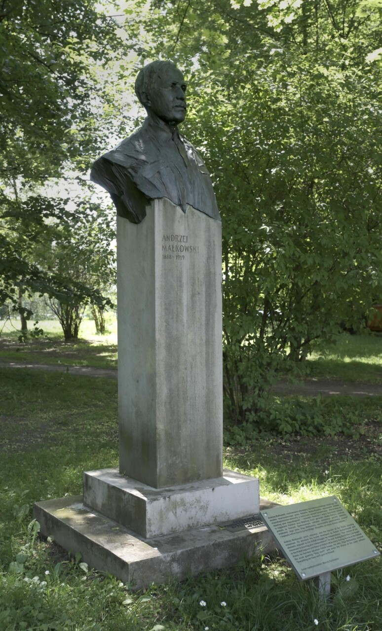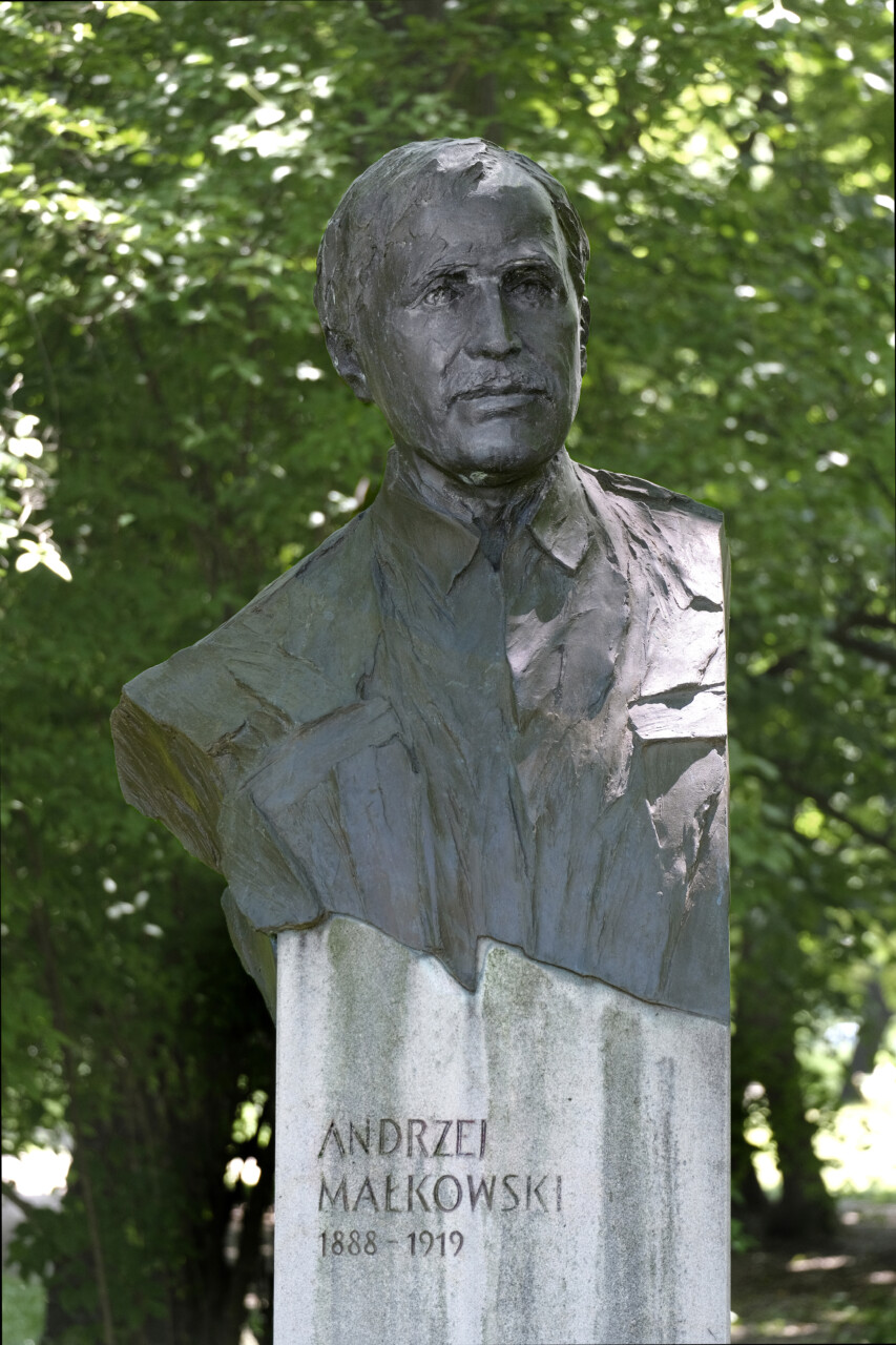 Popiersie Andrzeja Małkowskiego, brąz, piaskowiec, 210 x 45 cm., Park Jordana w Krakowie, 2011 r.