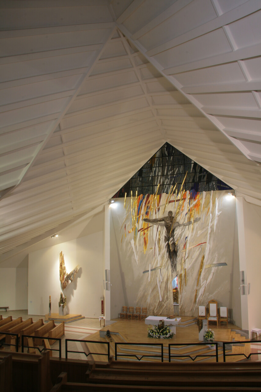 - malarstwo), stiuk, odlew z brązu, drewno, akryl, złocenia, witraż, 950 x 950 cm, 1997 r.